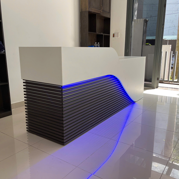 Quầy lễ tân trắng lam sóng 2m4 có đèn LTHD087 gây ấn tượng mạnh với thiết kế hiện đại – sang trọng, mặt trước ốp lam sóng tinh tế kết hợp đèn LED nổi bật, giúp khu vực đón tiếp khách trở nên thu hút và chuyên nghiệp. Tông màu trắng thanh lịch không chỉ tạo cảm giác rộng rãi, sạch sẽ mà còn dễ dàng phối hợp với nhiều phong cách nội thất khác nhau như văn phòng, showroom, spa hay thẩm mỹ viện cao cấp.